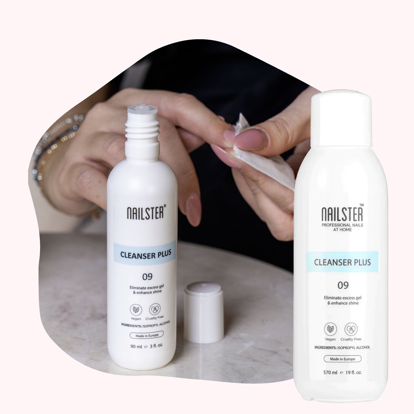 Anvendelse af Cleanser bidrager til en ren og steril proces, hvilket er essentielt for at undgå at patogener som bakterier og svampe trænger ind i huden eller neglen. Cleanser kan både anvendes på neglen, men også til at rengøre og desinficere dine værktøjer.